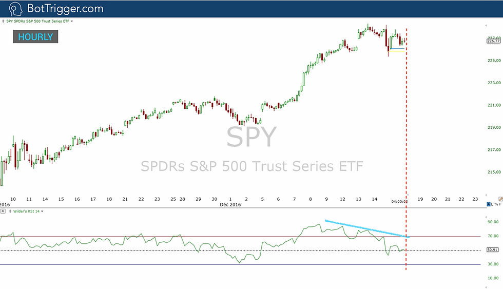So after pulling back down to a low 40-RSI on the hourly yesterday, the SPY is in the process of retesting its highs up near the $228 level. As a result, Apple has made incremental new highs. But unlike the prior two breakouts in Apple, the upside is now a struggle. You're seeing push and pull now. Apple's negative divergence also continues. Apple made new highs today on much lower momentum. In fact, Apple's hourly RSI did not cross back over the 70-RSI for the first time in this rally on today's highs. That's an indication that the buy-side momentum is waning and that we will see a struggle for a while.