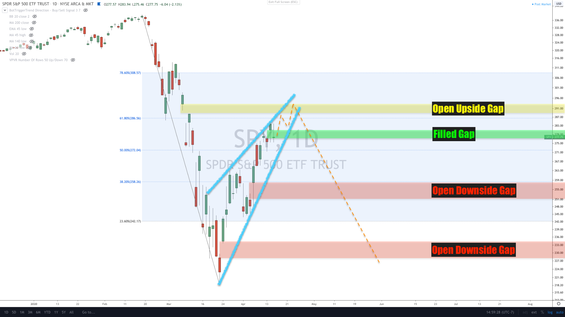 Remember, in 1987 and 2008, we had more moderate rebounds from the lows. And in both cases, the rebounds were shorter lived. It wasn't a 4-5 weeks rebound. The rebounds were a few days. That's it. Down the line we had longer rebounds. But that was well after the crash phase had ended. Multiple times the SPY staged rallies near the lows of the crisis in an effort to bottom out. But none were as robust as this rebound. So far, the SPY has rebounded over 30%. In 1987, the rebound went for 20%. In 2008, it peaked at 26%. So that is a bit concerning. A peak at $280 makes some sense. That's a small push beyond the 50% retracement by a few points. But a peak of $285 on the SPY sort of makes me question whether this is a larger recover specifically because it pushed way passed the 50% retracement level. The 62% retracement level sits around the $286 to $291 area. The SPY peaked only 5-6 points away from that level.