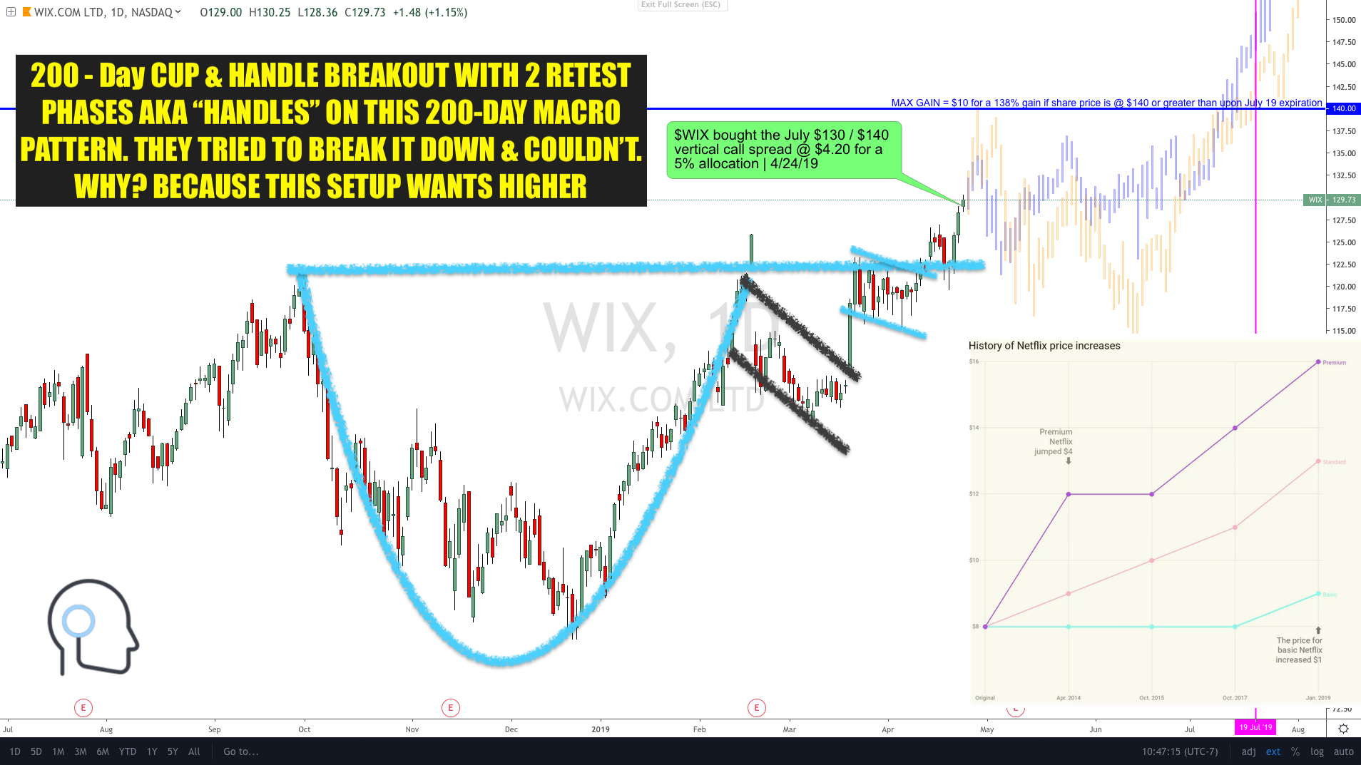 BotTrigger Trade Alert: $WIX bought the July 19th, 2019 $130 / $140 vertical call spread @ $4.20 for a 5% allocation.